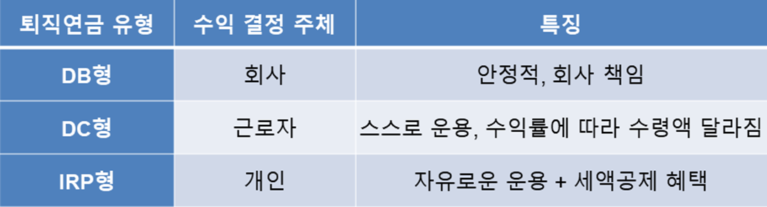 • DB형은 회사 책임, DC형과 IRP는 내 책임