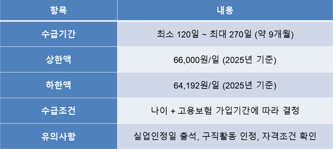 2025년 실업급여는 다음과 같은 상한·하한 기준이 적용됩니다: