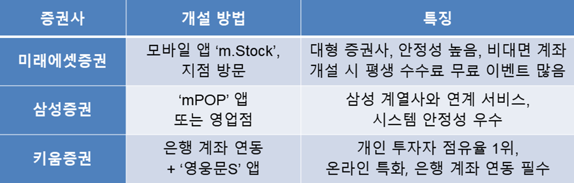 주요 증권사: 미래에셋증권, 삼성증권, 키움증권, 한국투자증권, NH투자증권