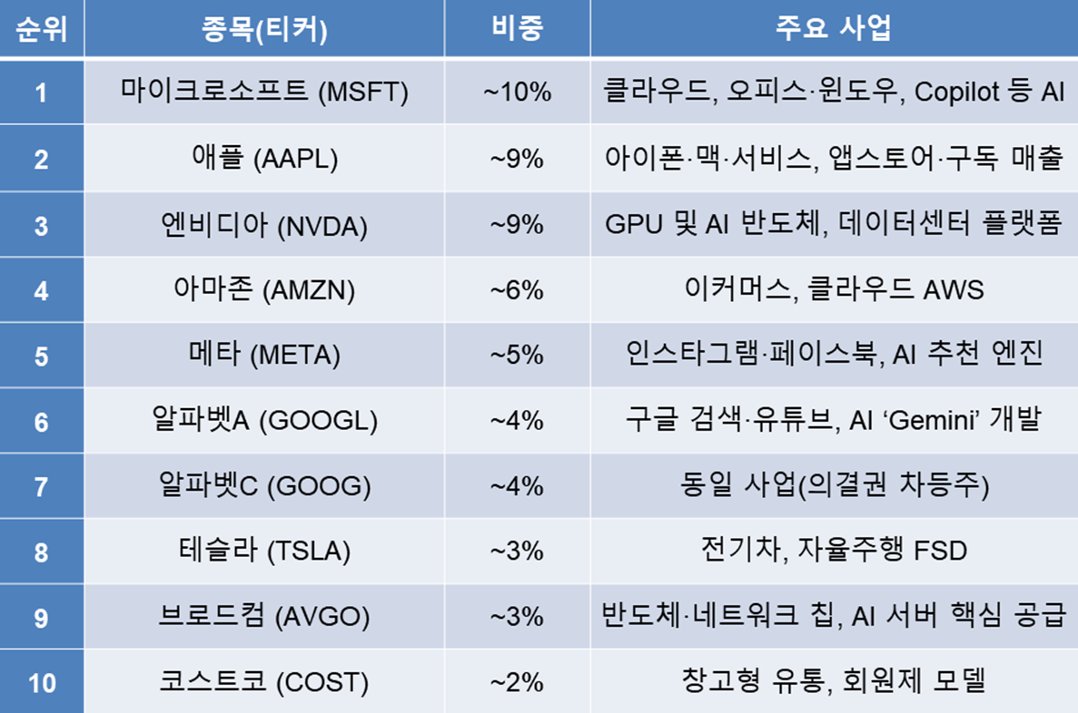 쉽게 말해, 애플·엔비디아·마이크로소프트 등 미국 빅테크를 한 번에 담은 ‘성장주 패키지’입니다.