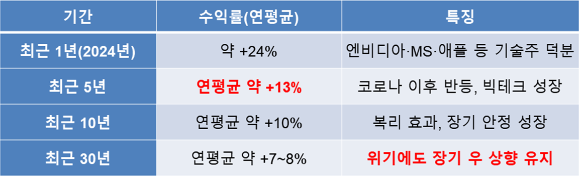 특히, 장기 투자자에게는 “S&P500ETF = 미국 경제 성장률에 투자”라는 공식이 성립합니다.