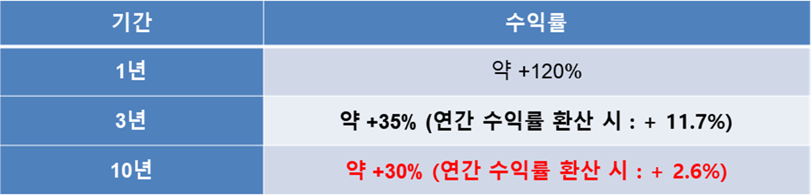 예를 들어, 10년 누적 수익률이 +30%라면, 연평균으로는 약 +2.6% 정도밖에 안 되는 거죠.