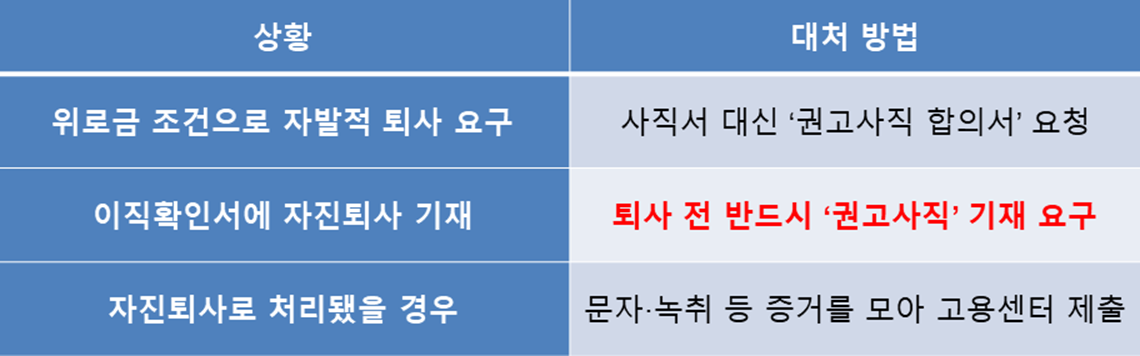 특히, 회사가 권고사직위로금 조건으로 자발적 퇴사 처리를 요구해도,