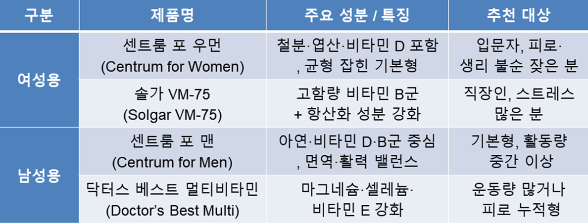 그래서 오늘은 남녀별 멀티비타민 선택 기준과 대표 제품을 한눈에 정리해 드리겠습니다.