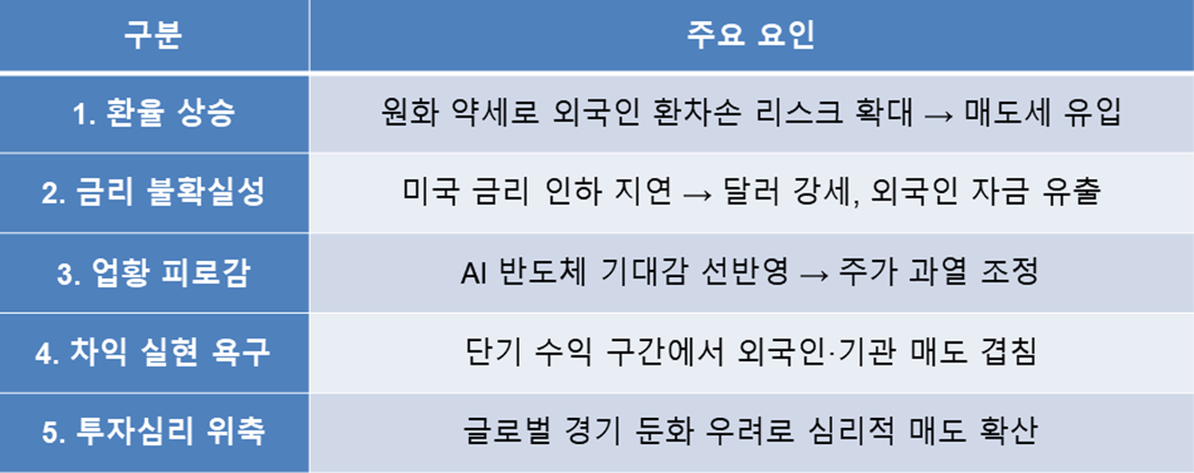 환율·금리·수급이 복합적으로 작용하며 시장이 잠시 ‘숨 고르기’를 하는 단계입니다.