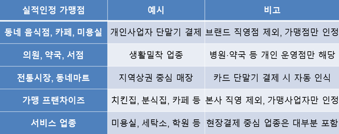 따라서 온라인 결제나 대형 유통사는 제외되며, 지역 기반 매장 결제가 실적에 포함됩니다.