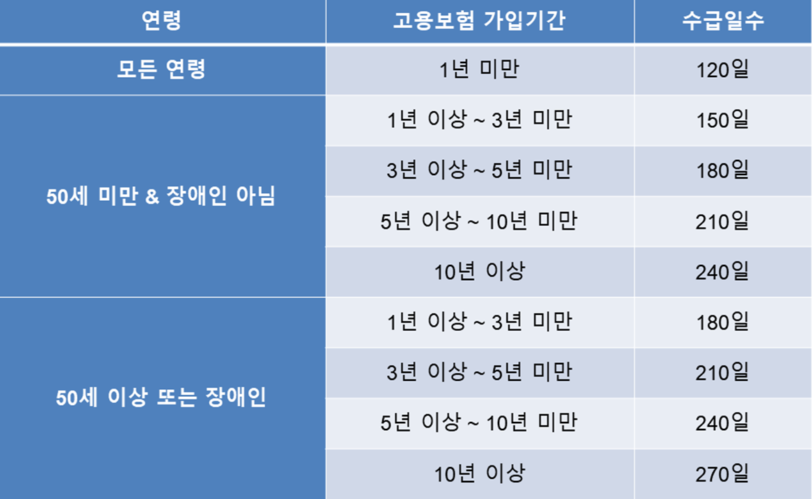 이 기간은 나이와 고용보험에 가입한 기간에 따라 다르게 정해집니다.