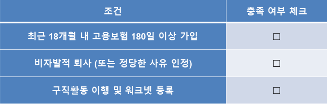 📌 위의 세 가지가 모두 ✔️ 되어야 실업급여 조건 충족입니다!