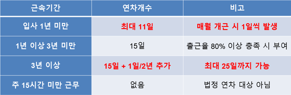 특히 첫 해엔 월 1일씩 주어지고, 그다음 해부터 15일이 생긴다는 점!