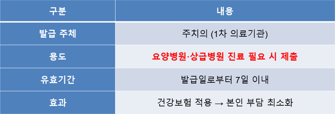 일반 의원(1차 의료기관)에서 진료 후, 전문적 치료가 필요하다고 판단될 때 발급해 줍니다.