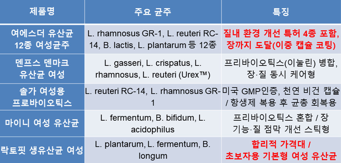 아래는 실제 시장 점유율과 균주 구성을 기준으로 선정한 여성 질유산균추천 상품입니다.