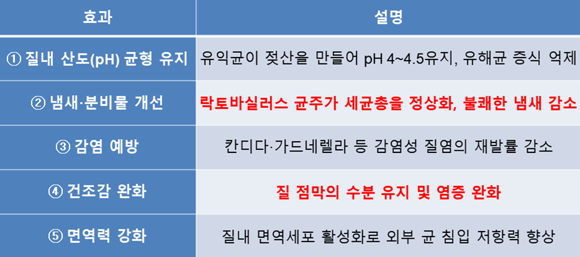 아래 표는 여성질유산균이 실제로 몸에 어떤 도움을 주는지를
