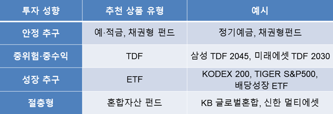 예·적금, 채권형 펀드, TDF(타깃데이트펀드), ETF 등 다양한 금융상품에 투자할 수 있습니다.