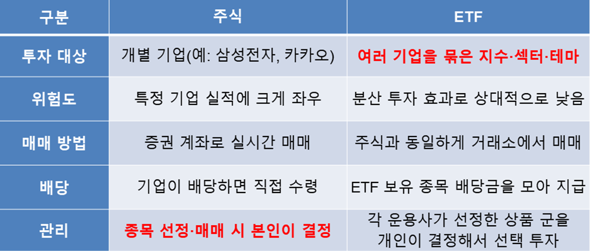 주식초보가 개별 종목을 고르기 어렵다면, ETF 하나로 자동으로 다양한 기업에 투자할 수 있죠.