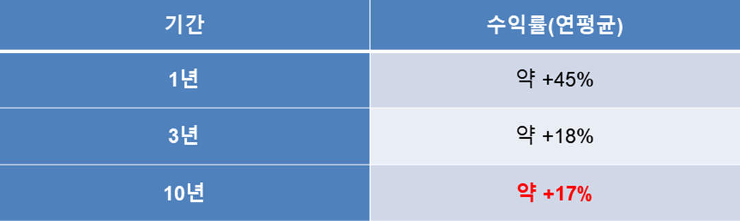 📌 10년 동안 연평균 17% 내외라니, 단순히 은행 예금이랑 비교할 수 없을 정도의 수익률입니다.